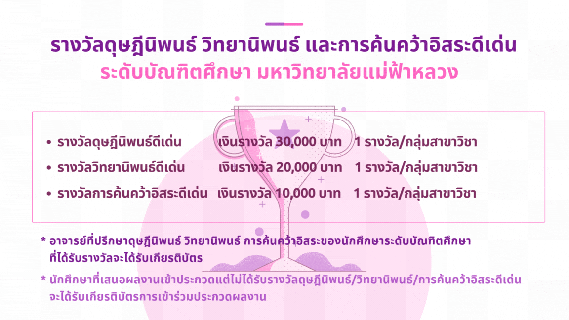 ขอแสดงความยินดีกับผู้ได้รับรางวัล ประจำปีการศึกษา 2567 พิธีมอบรางวัลวิทยานิพนธ์ และการค้นคว้าอิสระ ประจำปีการศึกษา 2567 ในกิจกรรมปฐมนิเทศนักศึกษาใหม่ ระดับบัณฑิตศึกษา ปีการศึกษา 2568 เมื่อวันที่ 2 สิงหาคม 2568 กลุ่มการนำเสนอรางวัล แบ่งออกเป็น 3 กลุ่มสาขาวิชา วิทยาศาสตร์-เทคโนโลยี วิทยาศาสตร์สุขภาพ มนุษยศาสตร์-สังคมศาสตร์ รางวัลดุษฎีนิพนธ์ วิทยานิพนธ์ และการค้นคว้าอิสระดีเด่น 1 รางวัล / กลุ่มสาขา รางวัลดุษฎีนิพนธ์ดีเด่น เงินรางวัล 30,000.- บาท 1 รางวัล/กลุ่มสาขาวิชารางวัลวิทยานิพนธ์ดีเด่น เงินรางวัล 20,000.- บาท 1 รางวัล/กลุ่มสาขาวิชารางวัลการค้นคว้าอิสระดีเด่น เงินรางวัล 10,000.- บาท 1 รางวัล/กลุ่มสาขาวิชา* อาจารย์ที่ปรึกษาดุษฎีนิพนธ์/วิทยานิพนธ์/การค้นคว้าอิสระของนักศึกษาระดับบัณฑิตศึกษาที่ได้รับรางวัลจะได้รับเกียรติบัตร* นักศึกษาที่เสนอผลงานเข้าประกวดแต่ไม่ได้รับรางวัลดุษฎีนิพนธ์/วิทยานิพนธ์/การค้นคว้าอิสระดีเด่น จะได้รับเกียรติบัตรการเข้าร่วมประกวดผลงาน กลุ่มการนำเสนอรางวัลแบ่งออกเป็น 3 กลุ่มสาขา 1. กลุ่มสาขาวิชาทางวิทยาศาสตร์-เทคโนโลยี 2. กลุ่มสาขาวิชาทางวิทยาศาสตร์สุขภาพ 3. กลุ่มสาขาวิชามนุษยศาสตร์-สังคมศาสตร์ กำหนดการรับสมัคร ประจำปีการศึกษา 2567 รับสมัครดุษฎีนิพนธ์/วิทยานิพนธ์/การค้นคว้าอิสระ ของนักศึกษาที่สำเร็จการศึกษาในปีการศึกษา 2566ที่มีผลการสอบป้องกันในระดับดี (Good) ขึ้นไป เปิดรับสมัครเพื่อขอรับรางวัล มกราคม - มีนาคม 2568 ประกาศผลการตัดสินผู้ได้รับรางวัล สิงหาคม 2568 ยื่นใบสมัคร หลักเกณฑ์และเงื่อนไข รางวัลดีเด่น ขอแสดงความยินดีกับผู้ได้รับรางวัล ประจำปีการศึกษา 2566 Previous slide Next slide บทสัมภาษณ์ผู้ได้รับรางวัล ประจำปีการศึกษา 2565